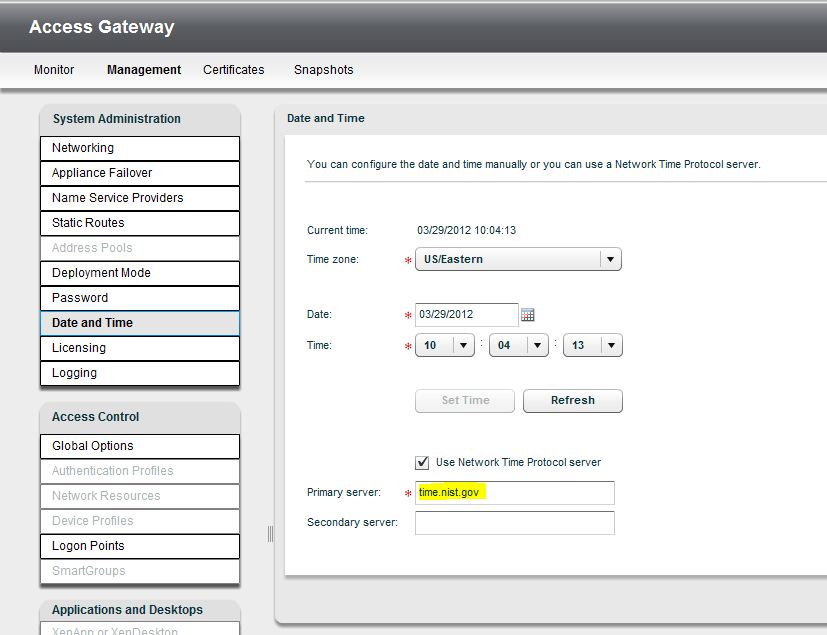 Then if you refreshed the page the logon page would appear, but logins were erroring with a message something like “Try again, or contact your help desk or system administrator for help”. Google searching for 500 errors on the Access Gateway pulled up a bunch of older articles that weren’t relevant to 5.0.4 version. When we went to the web interface of the appliances we noticed that there was a warning that the access gateway cannot connect to controller.