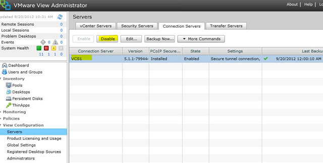 The question that I had during my View 5.1 ICM class was how to migrate active view sessions from one VMware View connection server to another, so that maintenance can be performed on one of the connection servers. The short version is that you if tunneling is used, you cant. This means that if you reboot your connection server you will drop connections and people will have to reconnect. Not such a huge deal, since if you are running into this scenario, you obviously have at least 2 connection servers which are probably load balanced and the users will simply reconnect.