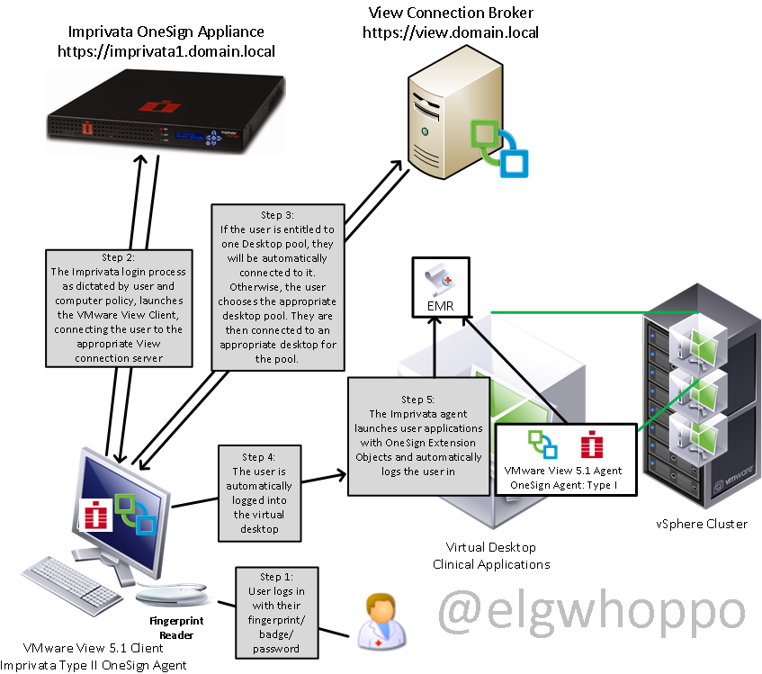 For this particular client, the Windows XP golden images were set, the pools had been configured, and the Imprivata VDI integration module was integrated and activated. Some of you guys who are VMware junkies may not know what functionality the Imprivata product brings to the table. Check out this drawing I made which basically outlines the functionality that it brings from a SSO and Clinical logon workflow perspective. Here is a drawing I put together that shows the average logon process with Imprivata integration.