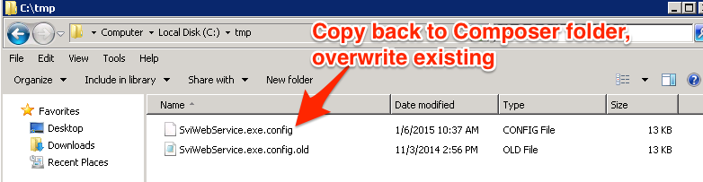 - Copy the SviWebService.exe.config file to a temp directory like C:\tmp and rename it to SviWebService.exe.config.old