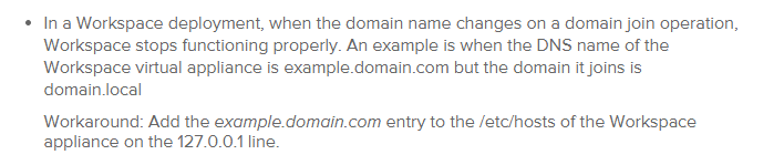 Turns out that if you join Horizon Workspace to the AD domain which uses a different URL namespace such as “pyro.local” than what you’d actually publish, such as “workspace.pyro.com” you actually have to modify the local hosts file of the appliance otherwise you’ll end up in an endless loop of frustration like I was for the past several hours. The worst part is that the config saves just fine, but now authentication no longer works, leaving you puzzled and sad. Just goes to show you, read the release notes. Hopefully this helps someone faster than google did previously for me.