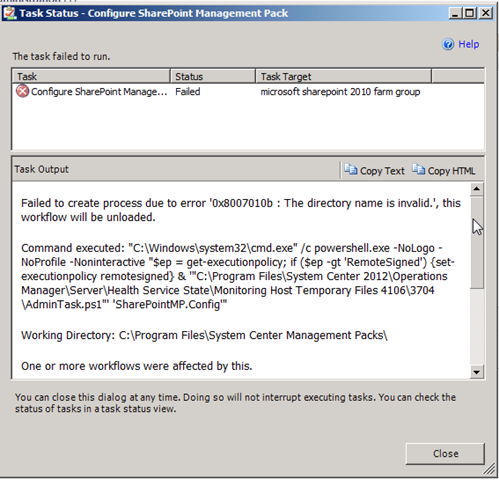 The short version with this error is that you need to use an updated management pack that isn’t currently publically available from Microsoft, I gleaned this from the above article titled Configuring the Sharepoint 2010 Management Pack in scenario 5. I wasn’t receiving the exact error described there, but it was darn close enough for a call to Microsoft to at least try this new management pack; especially because I couldn’t find that AdminTask.ps1 script file anywhere on the entire server. The new management pack that I imported was delivered to me in a zip file and only contained the MP named Microsoft.SharePoint.Foundation.2010.SCOM2012.mp.