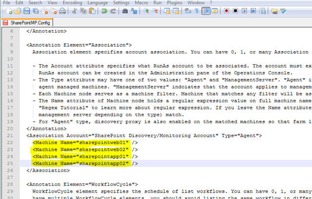 - You should ONLY modify this config file make new lines at or after line 22 of this document, where you should enter the short names of the web and application servers in the sharepoint farm. The association account should NOT be the display name of the account, it should be the runas group that was automatically created when the MP was imported.