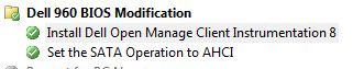 So I ran into an interesting situation when we started deploying Windows 7 out via OSD to Windows XP boxes recently. There were some PCs that would take FOREVER to download the image, which would actually end up failing the task sequence. What I ended up finding out was that these computers (Dell Optiplex 960’s) were set to use IDE in the BIOS, which set me out on the task of finding the fastest way to add a step to my task sequence to modify the BIOS during an OSD pushed OS upgrade. I looked into modifying the PE so that the change could be done from the BIOS, but in the time constraint I was working under I ended up simply installing the Dell Open Manage Client Instrumentation 8 (available here) on the Windows XP workstation and changing it before it was shut down as a part of the task sequence.